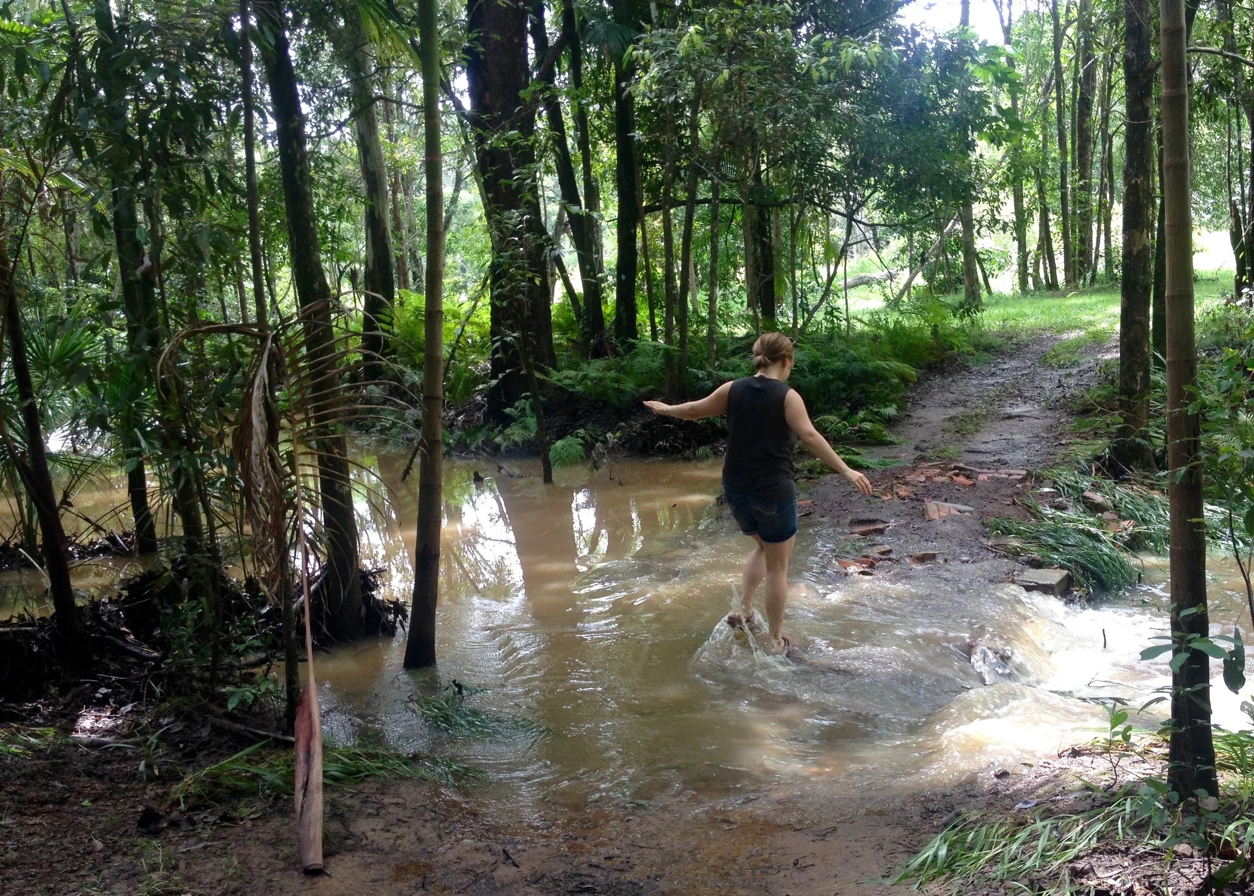 We got up early on our last day so we could spend one last hour planting at 'Lover's Copse' -- the wonderful spot we developed during our week there. The little pool now flows into the creek and is freed from weeds to allow palm trees, Golden Oak and sweet smelling flowering plants to flourish, attracting birds and forest dwellers...